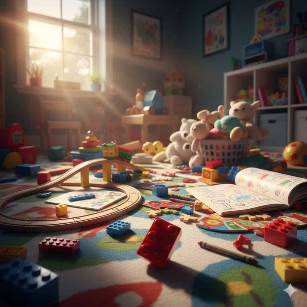 [IMAGE PROMPT: A happy, candid picture of a parent and child high-fiving in a playroom that is now clean. They are both looking at each other and laughing, which shows that they are working together and have achieved something together. The sun setting makes the room warm and golden.