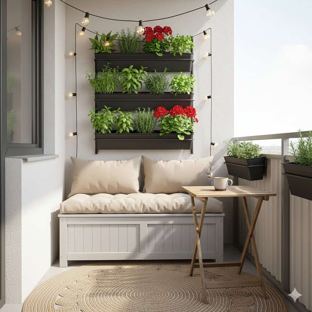 This is probably the best thing you can buy for a small patio: storage benches. You can sit on it and hide your gardening tools, cushions, or watering can inside.