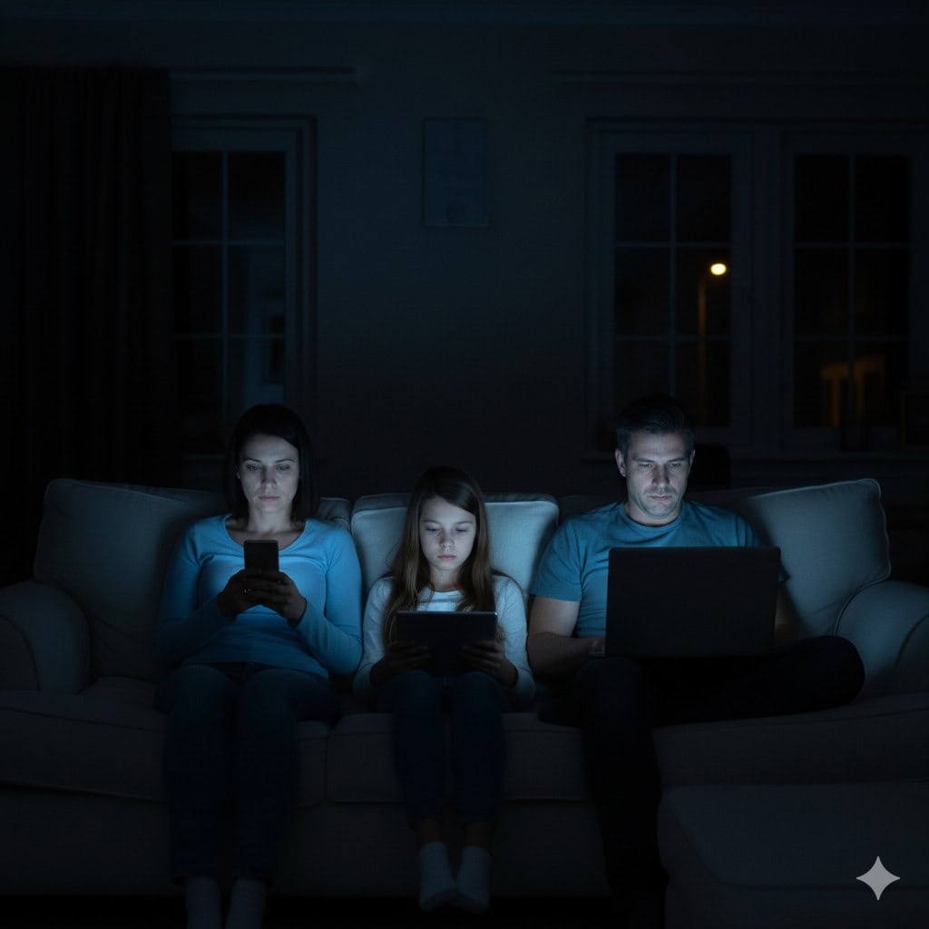 The other night, I looked up from my phone, where my thumb was still mindlessly scrolling through a news feed. There was no noise in the house. Not loud enough. The blue light from his own screen lit up my husband’s face across the living room. Our daughter was on the couch with her headphones on, lost in a tablet. We were all in the same room, but it felt like we were miles apart. That feeling of being “alone, together” really hit me. We weren’t really talking to each other; we were just living in our own digital worlds.