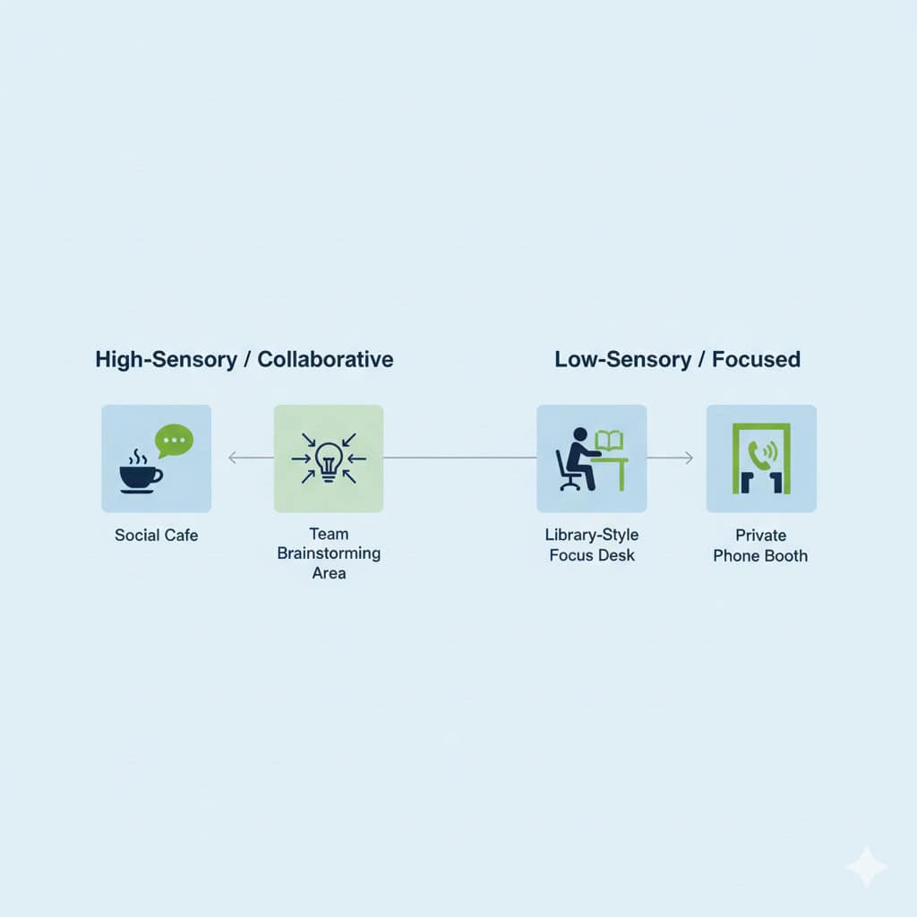 It’s about creating an environment with a variety of spaces and empowering employees to choose the one that best suits their task and their mental state at that moment. Instead of a single dish, it’s a buffet. An employee isn’t just “at their desk”; they are moving through a landscape of zones designed for different kinds of work, acknowledging their unique workplace sensory needs.